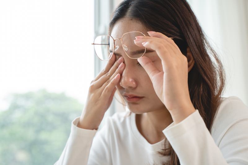 Junge Frau reibt sich die trockenen Augen